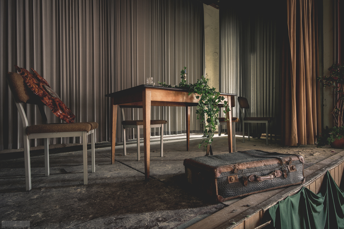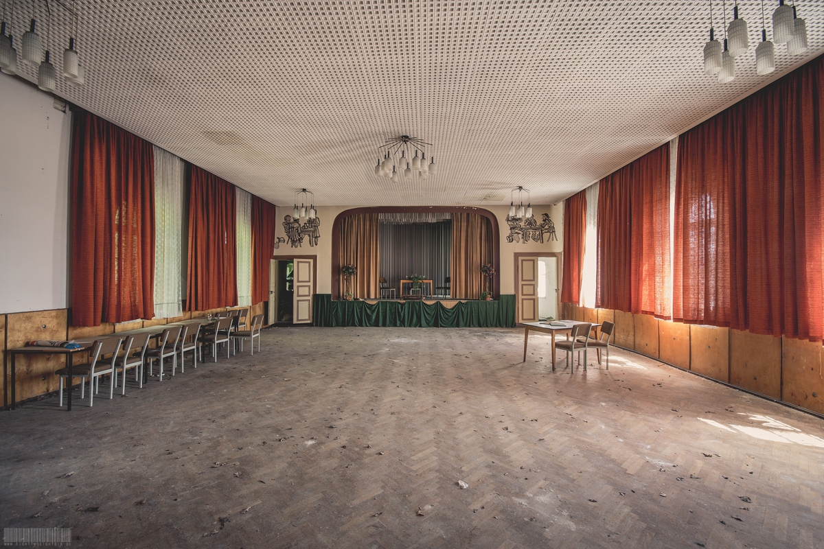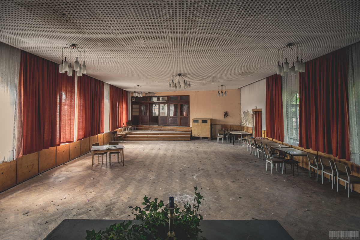 Der verlassene Ballsaal Lagune befindet sich in Sachsen und wirkte nahezu unberührt. Kaum Vandalismus und auch keine Graffitis verschandelten diesen wundervollen Lost Place. Besonders schön wirkten die roten Gardinen und die Gemälde über der Bühne. Darauf waren mehrere Personen erkennbar, welche zusammen am Tisch sitzen. Rechts und links befanden sich zudem auf der Bühne noch 2 künstliche Bäumchen. Zusammen mit der Bühnendekoration wirkte der ehemalige Ballsaal sehr atmosphärisch. Verlassen wurde dieses Gebäude vermutlich zu Beginn der 2000er Jahre. Im Hinterhof des Komplexes stand außerdem noch ein vergessener blauer Trabant. Dieser zeigte einen schönen Verfall, war aber den Umständen entsprechend noch recht gut erhalten.