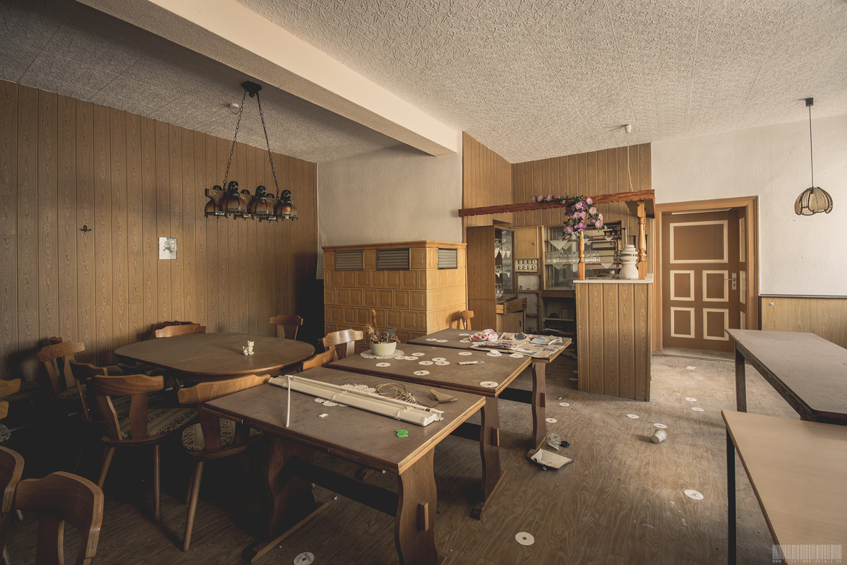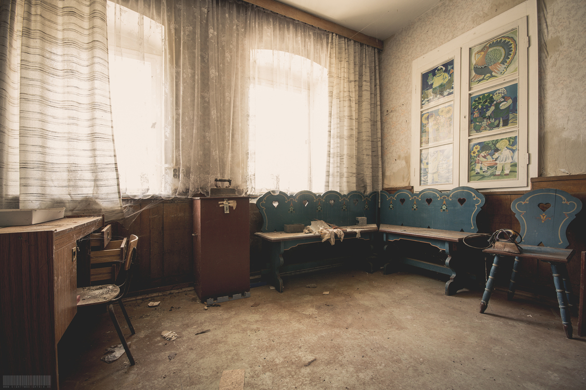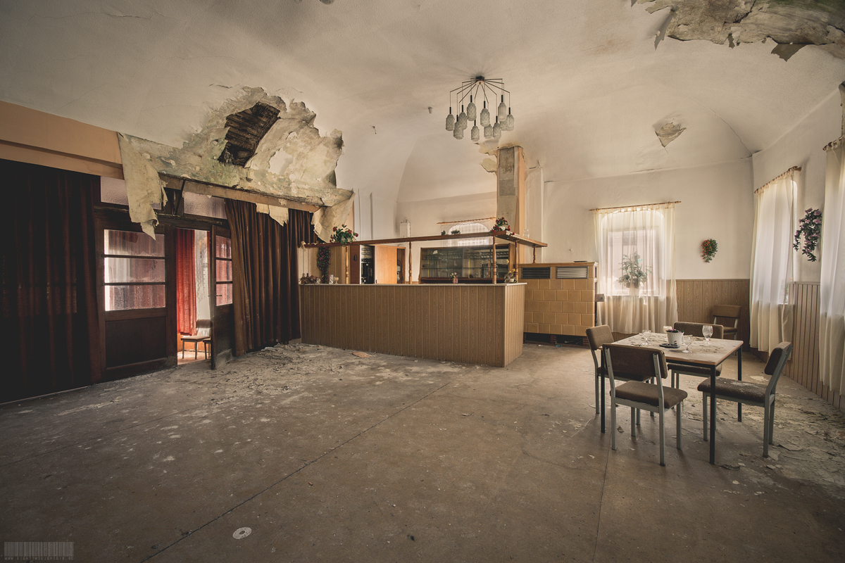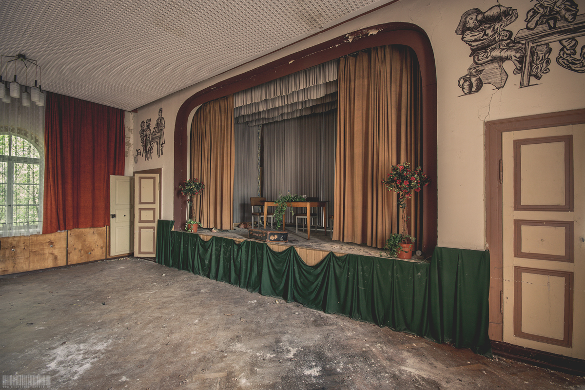 Der verlassene Ballsaal Lagune befindet sich in Sachsen und wirkte nahezu unberührt. Kaum Vandalismus und auch keine Graffitis verschandelten diesen wundervollen Lost Place. Besonders schön wirkten die roten Gardinen und die Gemälde über der Bühne. Darauf waren mehrere Personen erkennbar, welche zusammen am Tisch sitzen. Rechts und links befanden sich zudem auf der Bühne noch 2 künstliche Bäumchen. Zusammen mit der Bühnendekoration wirkte der ehemalige Ballsaal sehr atmosphärisch. Verlassen wurde dieses Gebäude vermutlich zu Beginn der 2000er Jahre. Im Hinterhof des Komplexes stand außerdem noch ein vergessener blauer Trabant. Dieser zeigte einen schönen Verfall, war aber den Umständen entsprechend noch recht gut erhalten.