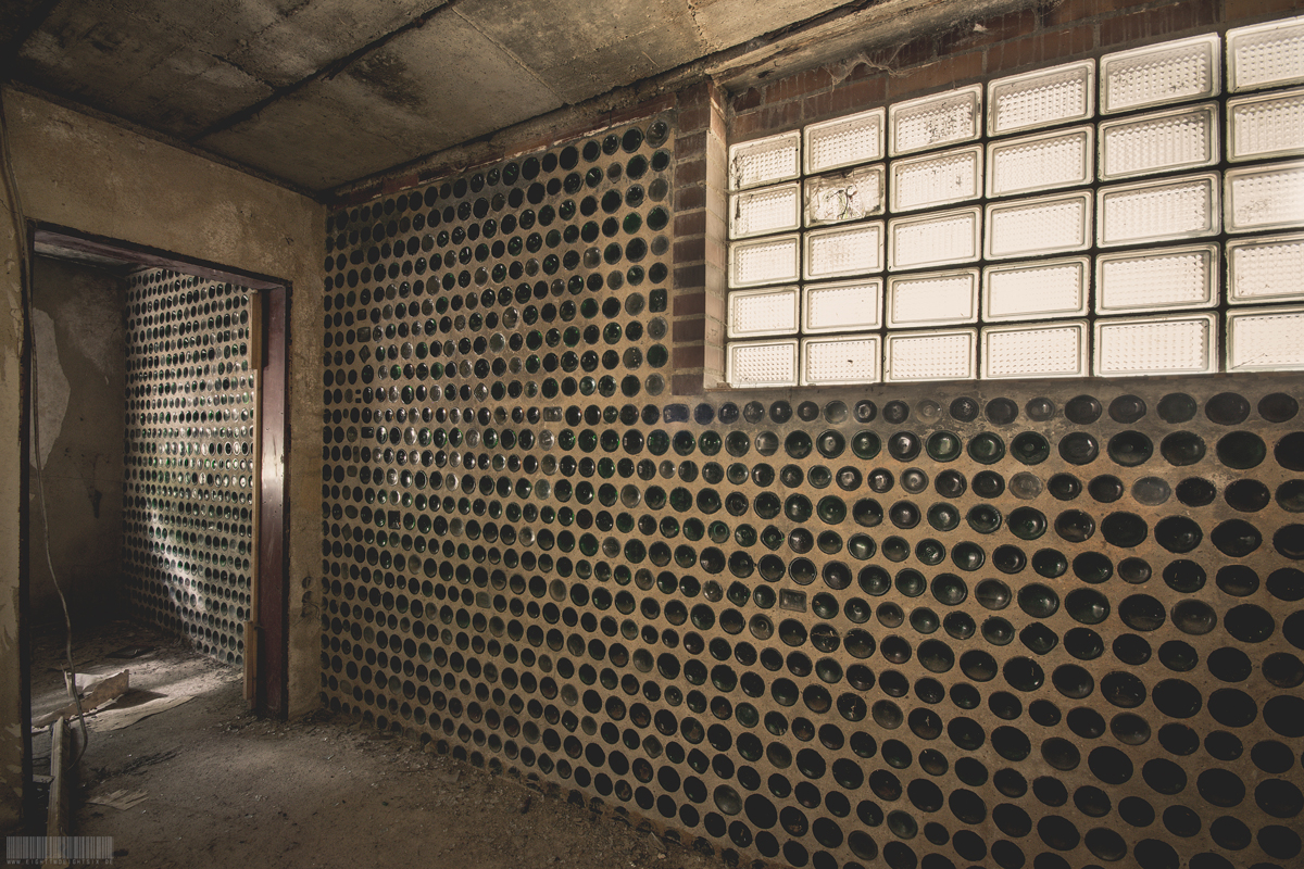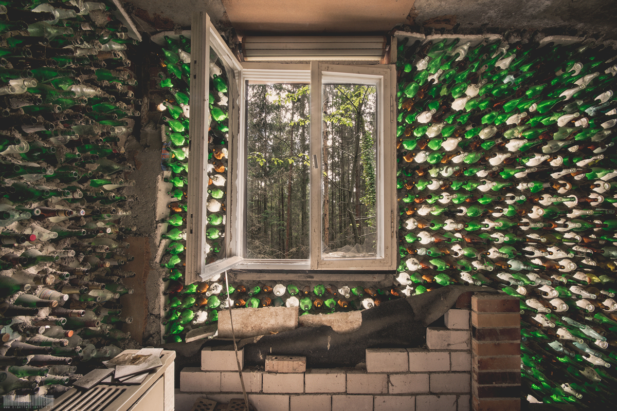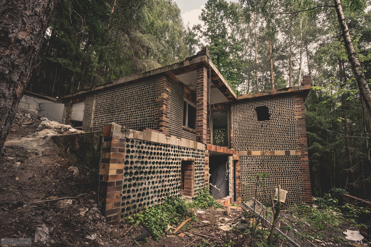 Tief im Wald befindet sich im bayrischen Oberfranken das verlassene Flaschenhaus. Skurril anwirkend steht es mitten im Wald, ohne Zufahrtsstraße fernab der Zivilisation. Fast schon touristisch bildet das Flaschenhaus ein beliebtes Ausflugziel für Mountainbiker und Wanderer. Bei diesem Lost Place handelt es sich um einen Schwarzbau, der einst aus finanzieller Not heraus errichtet wurde. Ein alleinstehender Mann soll der kreative Bauherr gewesen sein. Es mangelte ihm jedoch nicht an handwerlichem Geschick und der nötigen Kreativität. Akribisch setzte er Flasche auf Flasche im Verbund mit Beton zu Wänden zusammen. Das Gebäude verfügte sogar über ein komplettes Badezimmer und Strom- sowie TV Anschluss. Den Strom erzeugte er wahrscheinlich mit Generatoren. Aufgrund von starkem Vandalsimus befindet sich das Flaschenhaus allerdings mittlerweile in sehr schlechtem Zustand und kommt einer Ruine gleich.