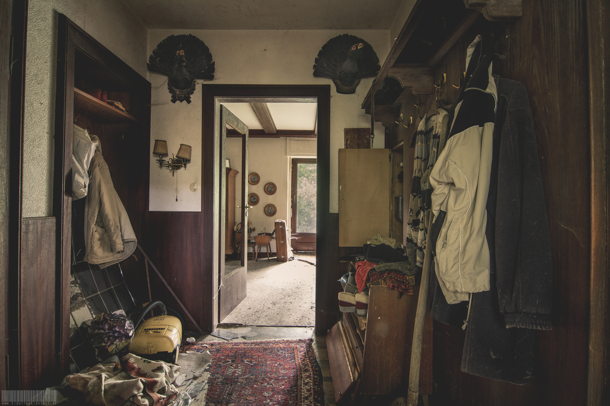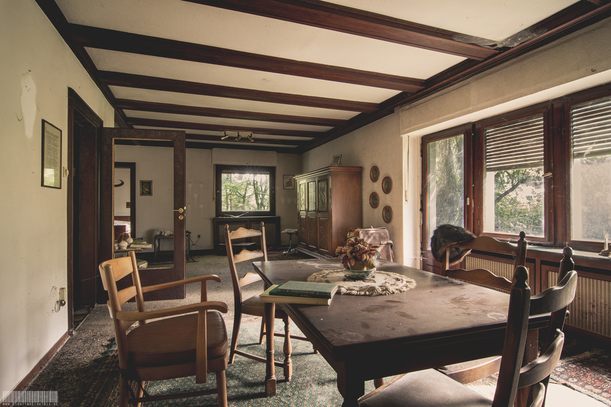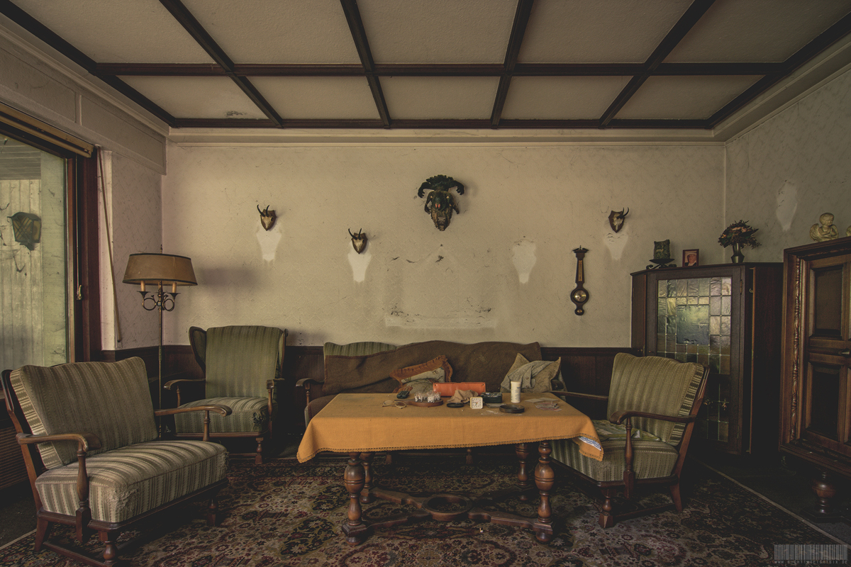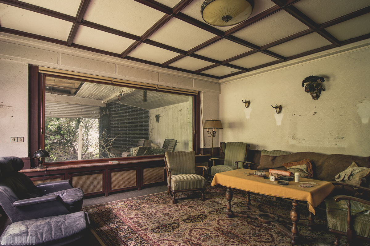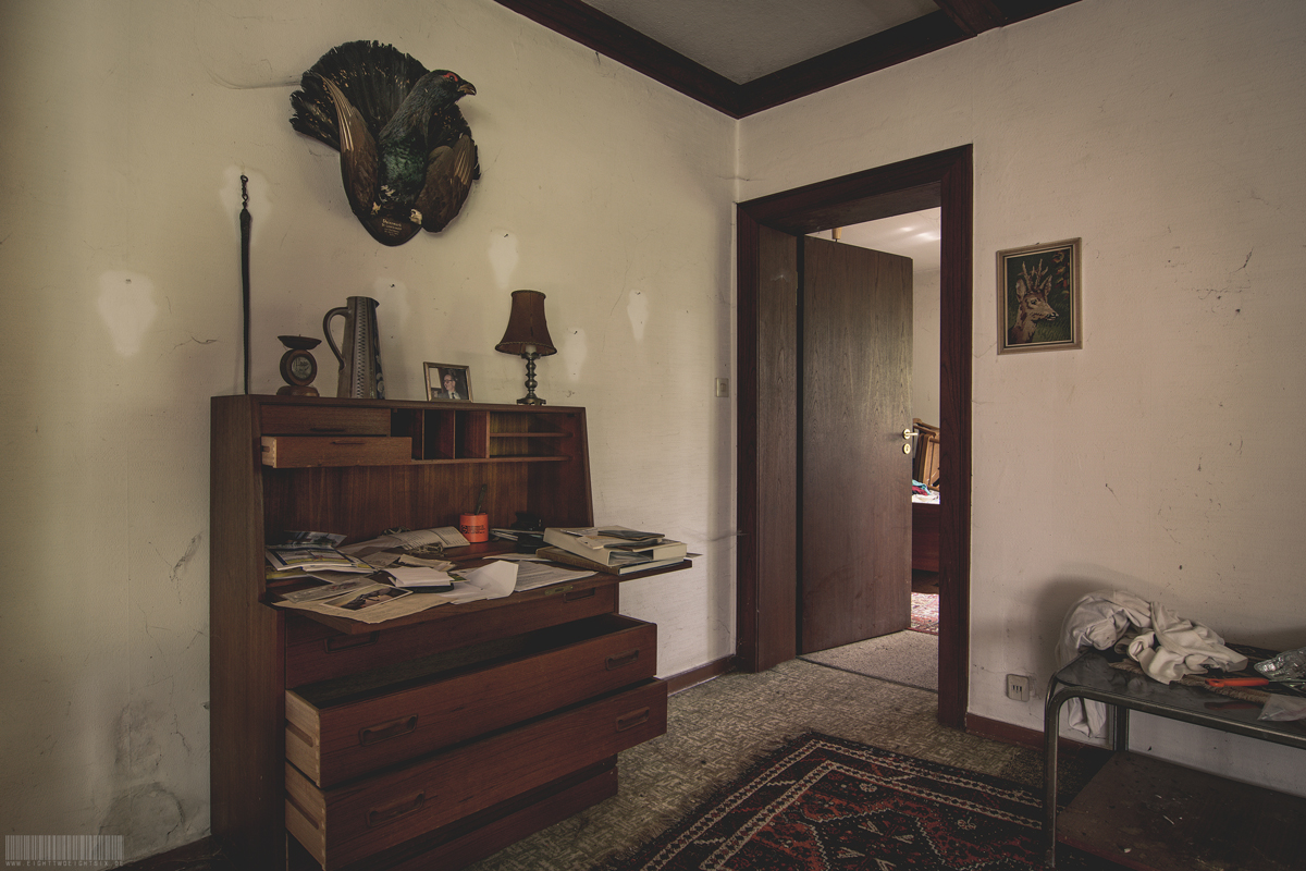Diese kleine idyllische Bungalow gehörte einst einem Jäger. Abgelegen am Waldrand steht sein ehemaliges Wohnhaus nun einsam und verlassen. In seiner Garage hängen noch die Häken an denen er scheinbar seine Beute zum Ausbluten aufhing. Im Keller befindet sich noch der Rest seines Jagd- bzw. Schlachtwerkzeuges. Das restliche Heim war jedoch liebevoll eingerichtet. Ein wunderschönes Wohnzimmer mit Blick auf die Terrasse sowie ein lichtdurchflutetes Speisezimmer waren noch nahezu unversehrt. Lediglich einige seiner Jagdtrophäen wurden entwendet, wie man an den Wänden erkennen kann. Einige sind allerdings noch vorhanden. Er liebte es allem Anschein nach, neben Wild auch Auerhähne zu jagen. Davon waren noch 3 Trophäen vorhanden. Außerdem standen noch Bilder seiner Frau die wahrscheinlich vor Ihm starb auf den Schränken. Im Keller war zudem noch eine sehr gemütliche Bar vorzufinden. Hier trank er sicher mit seinen Jagdfreunden den ein oder anderen Drink. Falls einer von Ihnen zuviel davon hatte konnte er sich direkt nebenan im Gästezimmer ausschlafen. Ein sehr schönes kleines Haus was nun alle Kriterien eines Lost Places erfüllt und im Laufe der Zeit immer weiter verfallen wird. Der Garten hat sich bereits in einen kleinen Dschungel verwandelt.