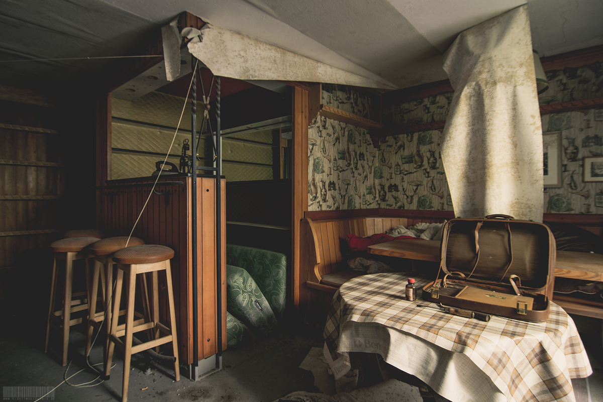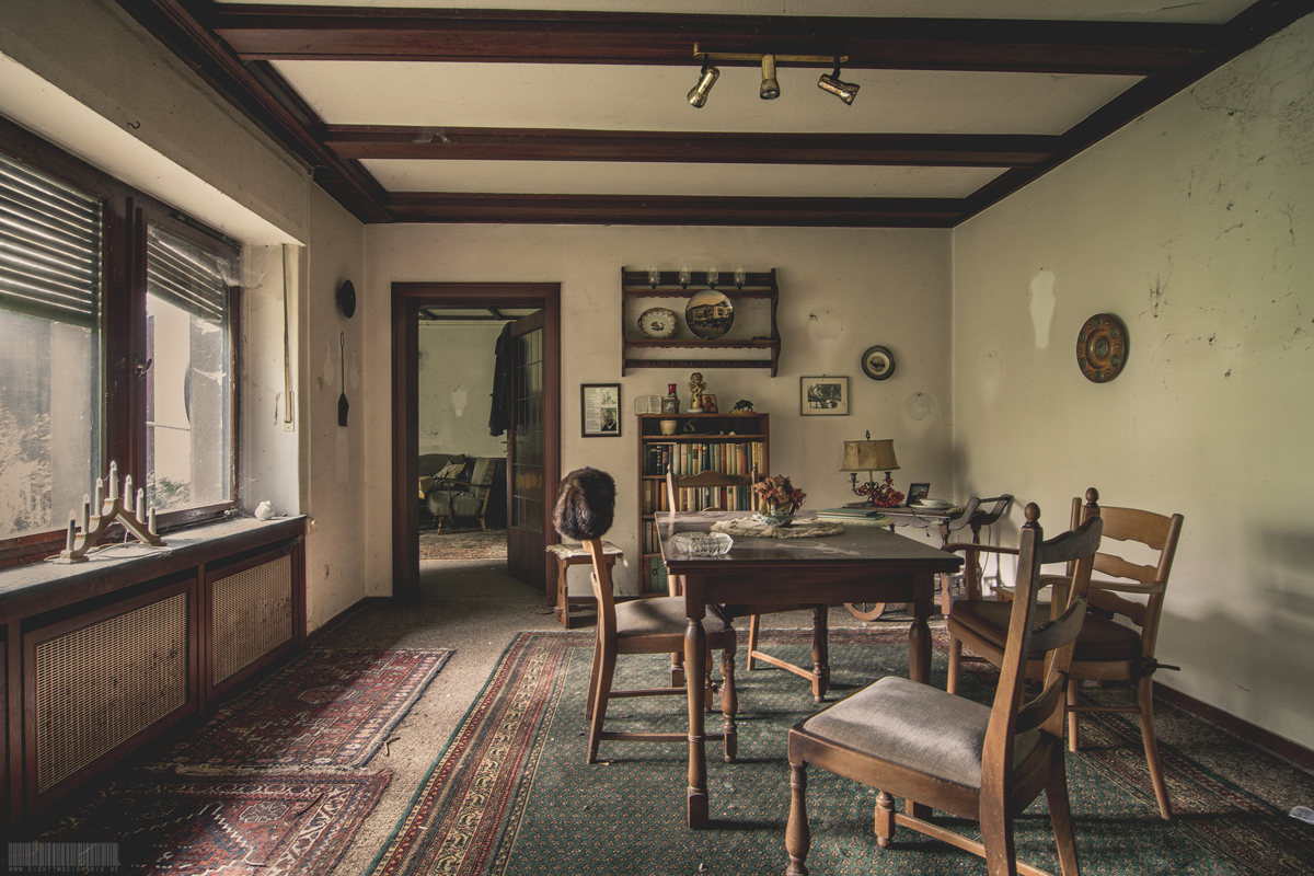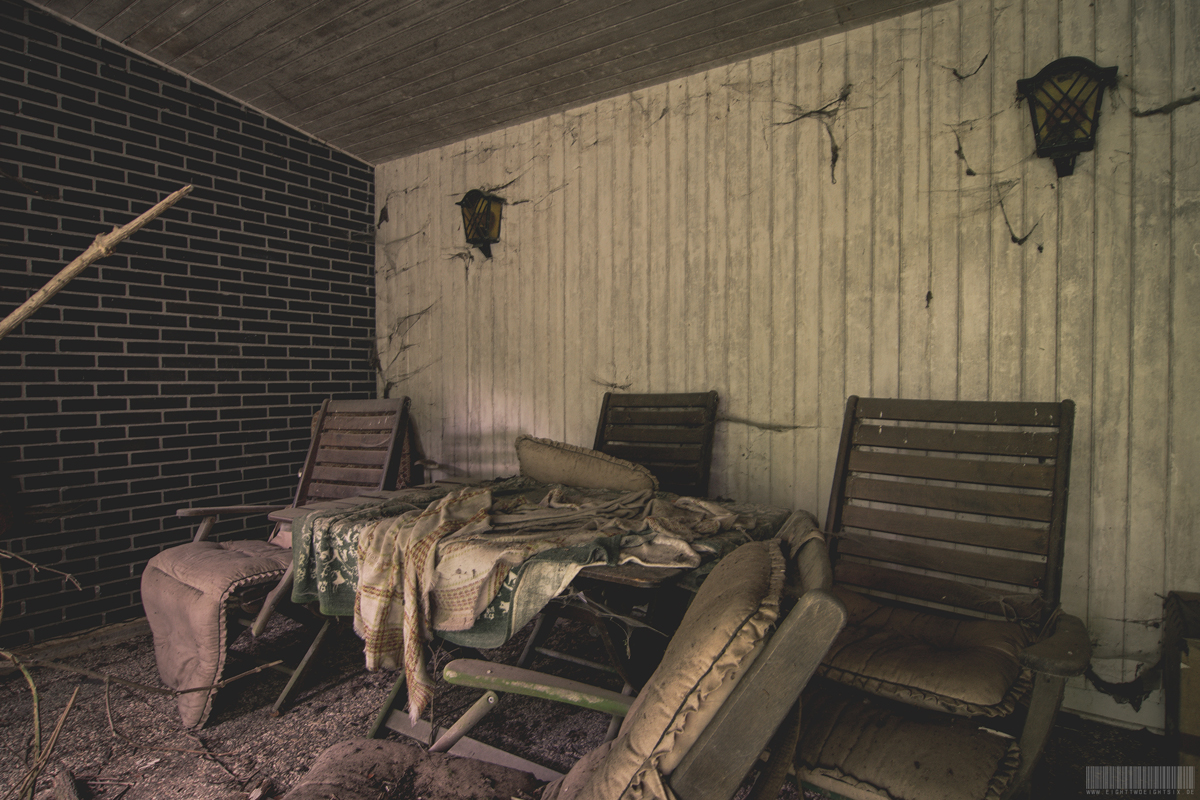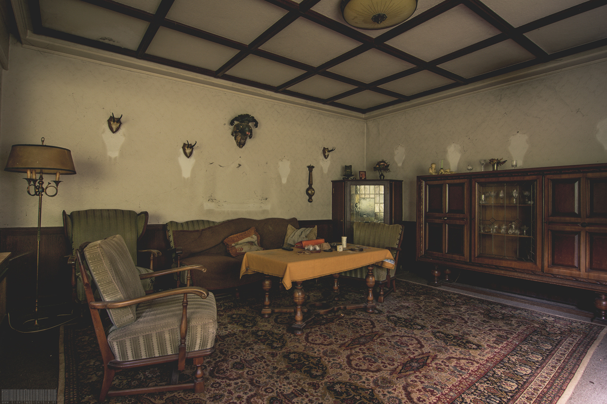 Diese kleine idyllische Bungalow gehörte einst einem Jäger. Abgelegen am Waldrand steht sein ehemaliges Wohnhaus nun einsam und verlassen. In seiner Garage hängen noch die Häken an denen er scheinbar seine Beute zum Ausbluten aufhing. Im Keller befindet sich noch der Rest seines Jagd- bzw. Schlachtwerkzeuges. Das restliche Heim war jedoch liebevoll eingerichtet. Ein wunderschönes Wohnzimmer mit Blick auf die Terrasse sowie ein lichtdurchflutetes Speisezimmer waren noch nahezu unversehrt. Lediglich einige seiner Jagdtrophäen wurden entwendet, wie man an den Wänden erkennen kann. Einige sind allerdings noch vorhanden. Er liebte es allem Anschein nach, neben Wild auch Auerhähne zu jagen. Davon waren noch 3 Trophäen vorhanden. Außerdem standen noch Bilder seiner Frau die wahrscheinlich vor Ihm starb auf den Schränken. Im Keller war zudem noch eine sehr gemütliche Bar vorzufinden. Hier trank er sicher mit seinen Jagdfreunden den ein oder anderen Drink. Falls einer von Ihnen zuviel davon hatte konnte er sich direkt nebenan im Gästezimmer ausschlafen. Ein sehr schönes kleines Haus was nun alle Kriterien eines Lost Places erfüllt und im Laufe der Zeit immer weiter verfallen wird. Der Garten hat sich bereits in einen kleinen Dschungel verwandelt.