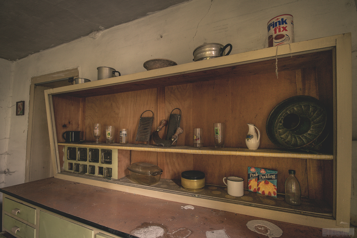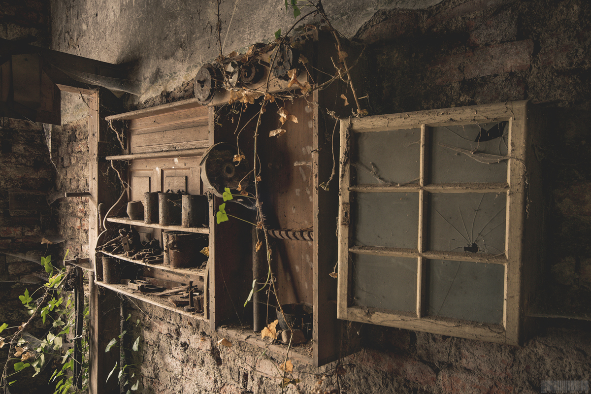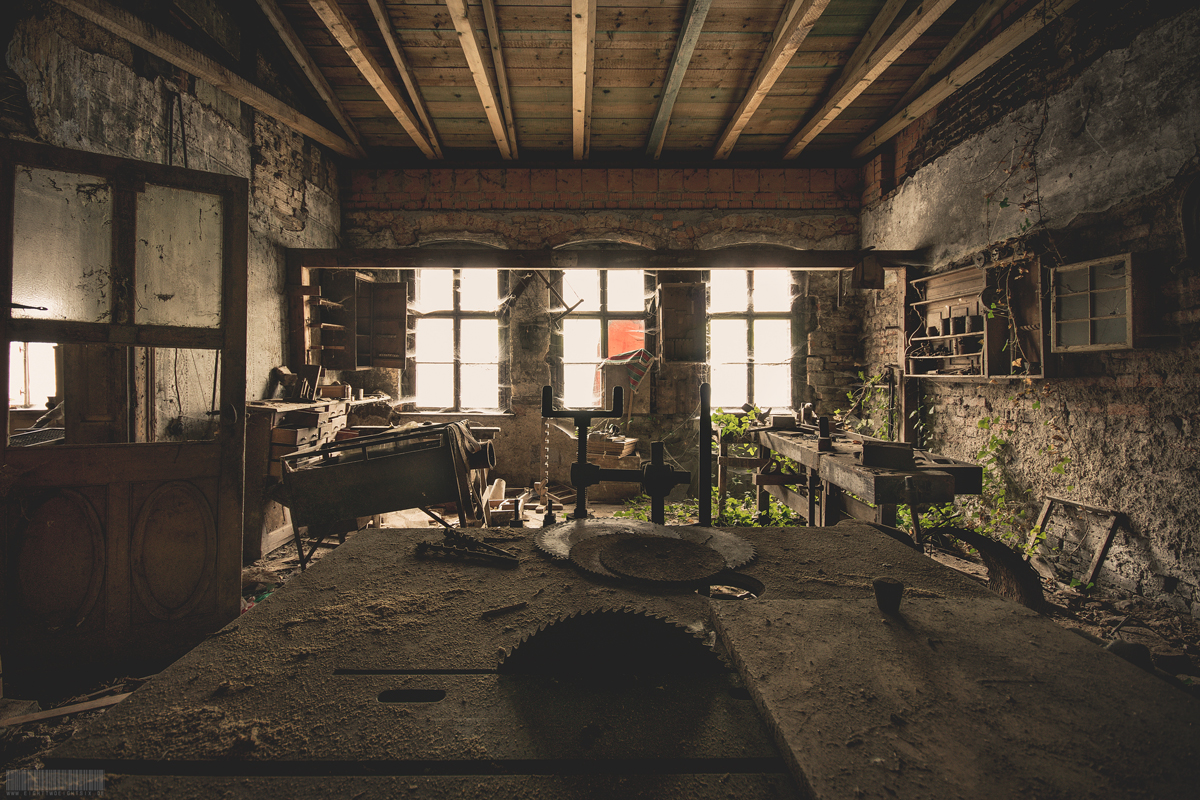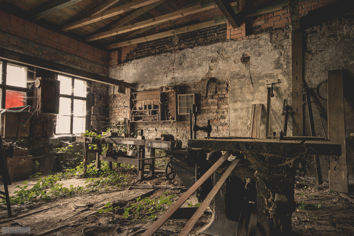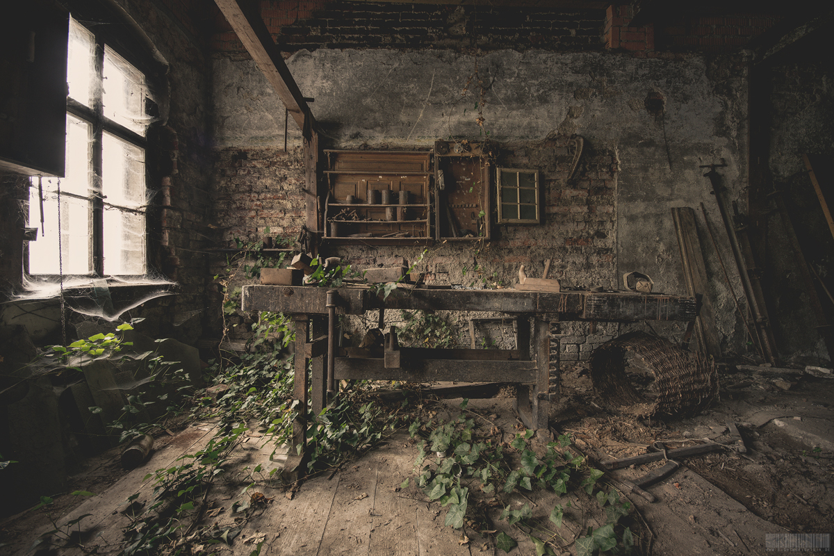Im Untergeschoss befand sich noch ein Wohn- und Küchenbereich sowie ein Schlafzimmer. Außerdem gelangte man durch die Küche in den beeindruckendsten Raum des ganzen Gebäudes. Die verlassene Werkstatt im Haus des Tischlers. Wunderschön erstrahlte diese im durch die Fenster einstrahlenden Lichtschein. Besonders toll war der Pflanzenbewuchs und der natürliche Verfall der Werkstatt. Generell befand sich das Gebäude in einem schlechten baulichen Zustand. Die Böden waren morsch, teils löchrig, die Wände bröselig und kurz vorm Kollaps. Leider ließ sich zur Geschichte des Gebäudes wenig herausfinden. Ausschließlich das hier für kurze Zeit noch Chinesen lebten nachdem das Gebäude an einen Chinese verkauft wurde. Bleibt zu hoffen, dass das Haus des Tischlers noch einige Zeit in diesem Zustand erhalten bleibt.