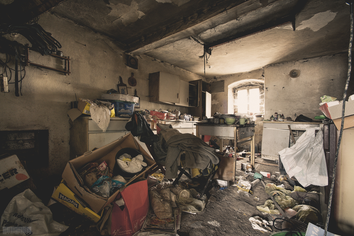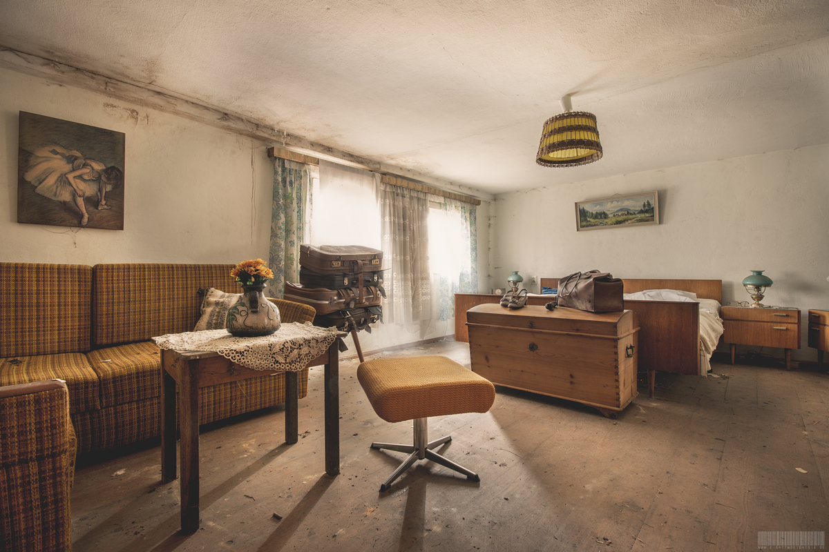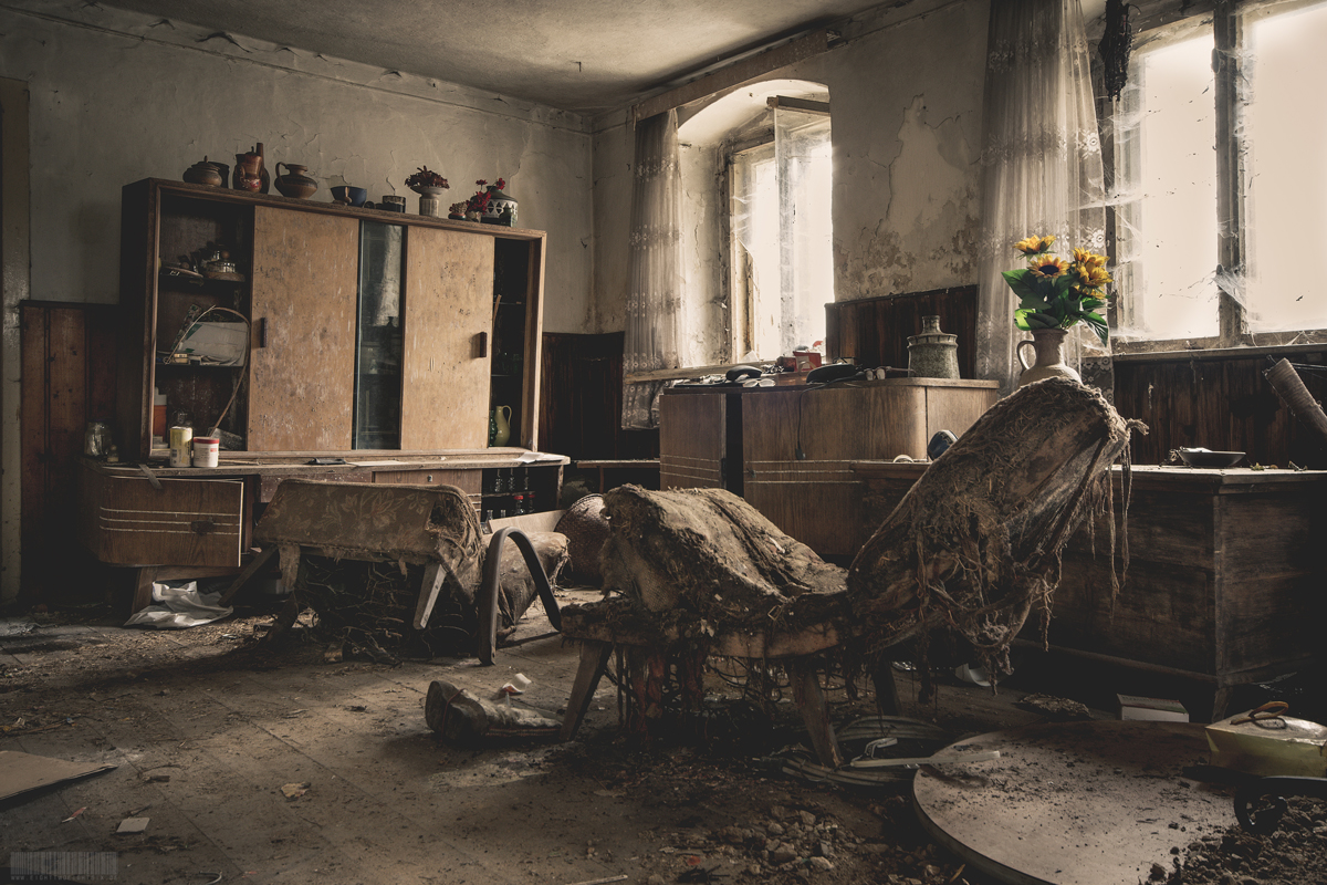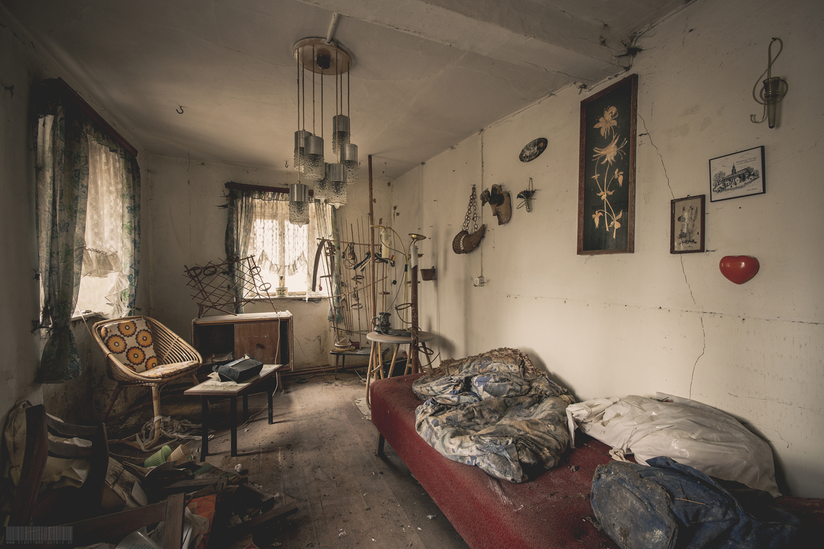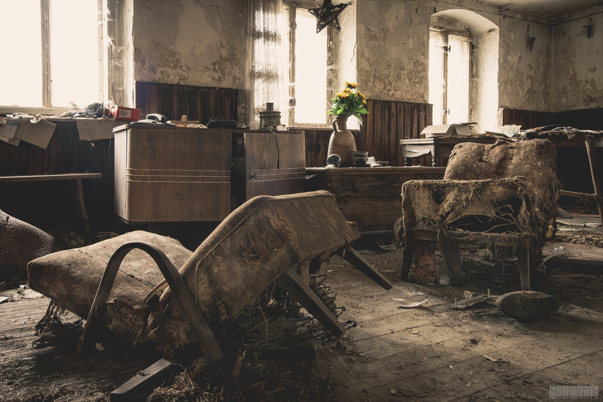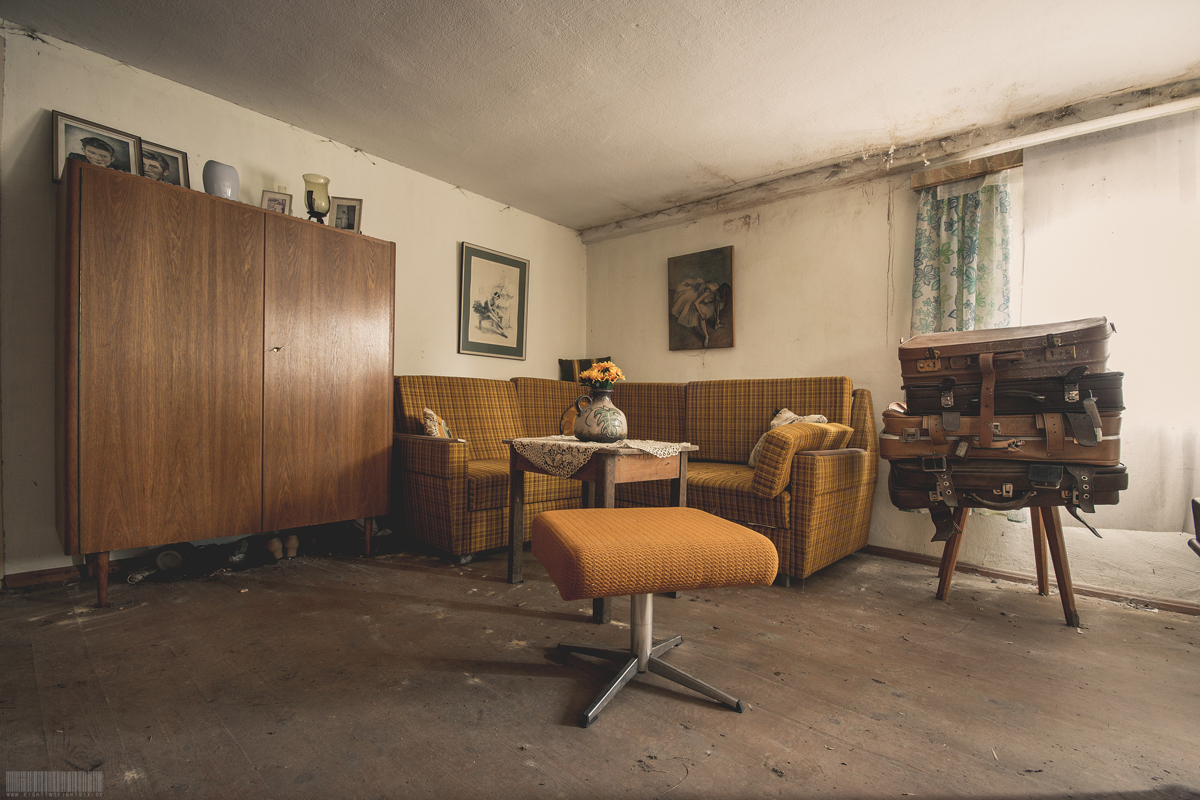 Im Erdgeschoss befand sich ein Wohnzimmer mit Nebenraum, die Küche und ein kleiner Stall. Allerdings waren alle Räume in diesem Geschoss stark durch einen Wasserschaden in Mitleidenschaft gezogen. Dies sorgte allerdings für einen wunderschönen Verfall. Besonders schön anzusehen bei den beiden Sesseln, die sich nach und nach auflösen. Das Obergeschoss war im Bereich des Flurs massiv überflutet von Kisten, gefüllt mit Utensilien jeglicher Art. Des Weiteren befanden sich im Obergeschoss 5 Schlafräume und 3 Wohnräume. Davon waren jedoch nur noch wenige begehbar aufgrund der enormen Ansammlung von Gegenständen davor bzw. auch in den Räumen.