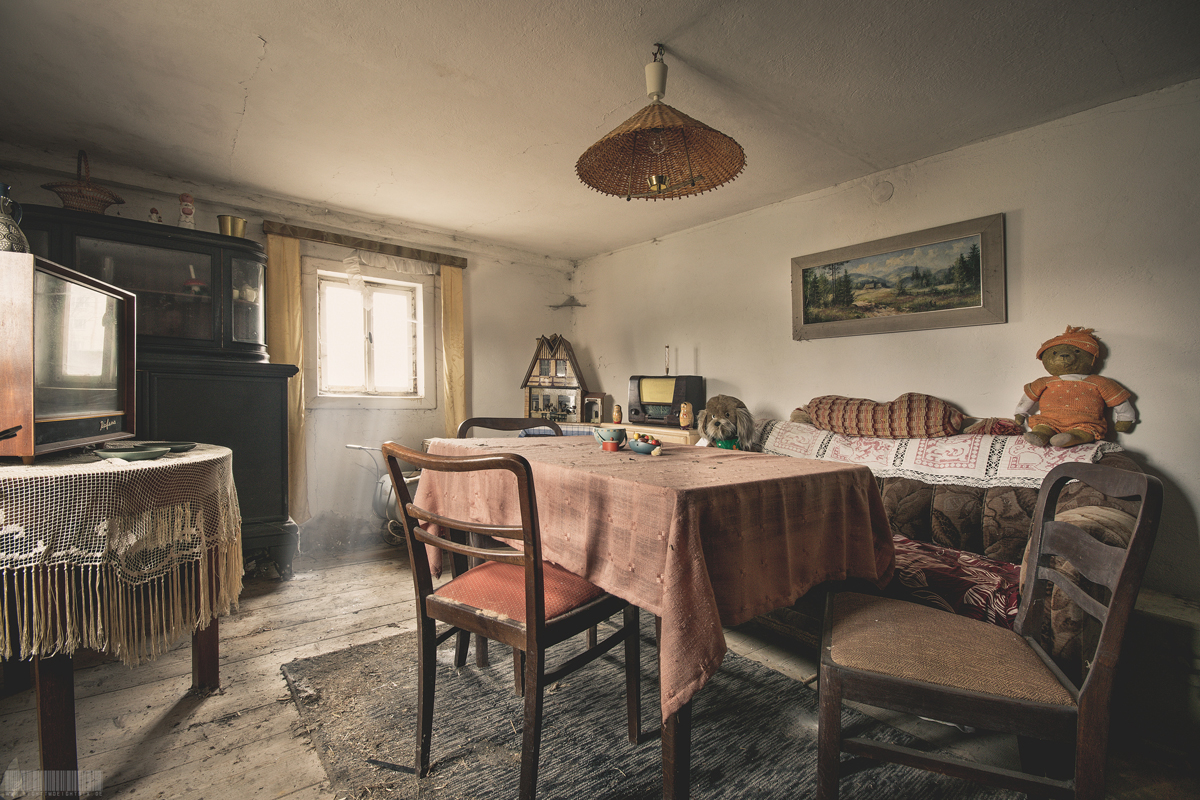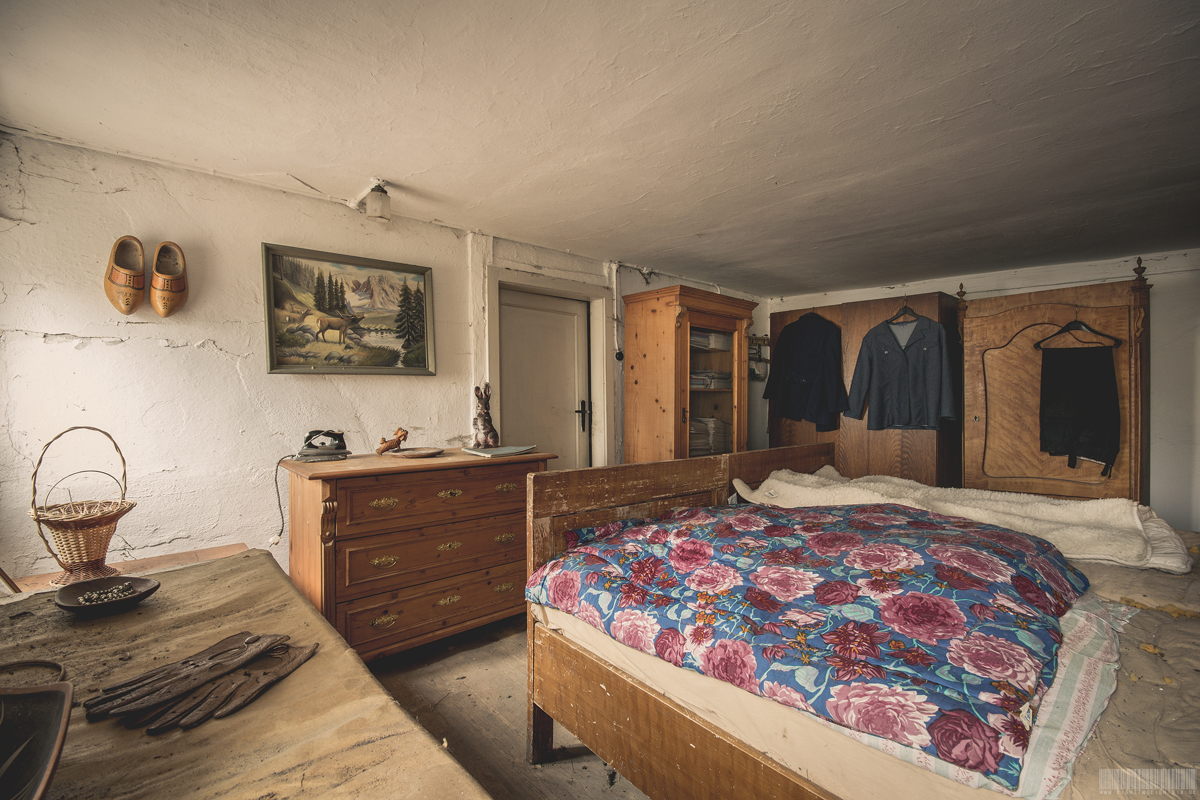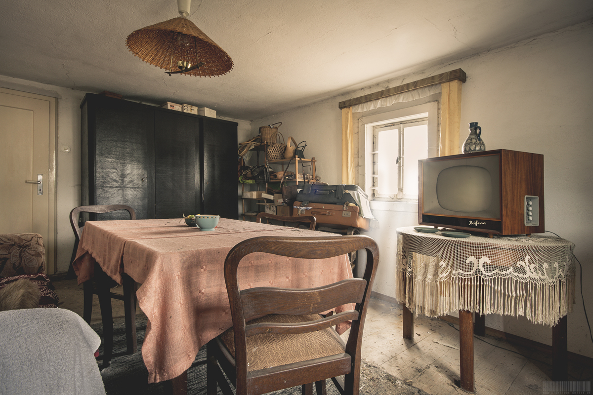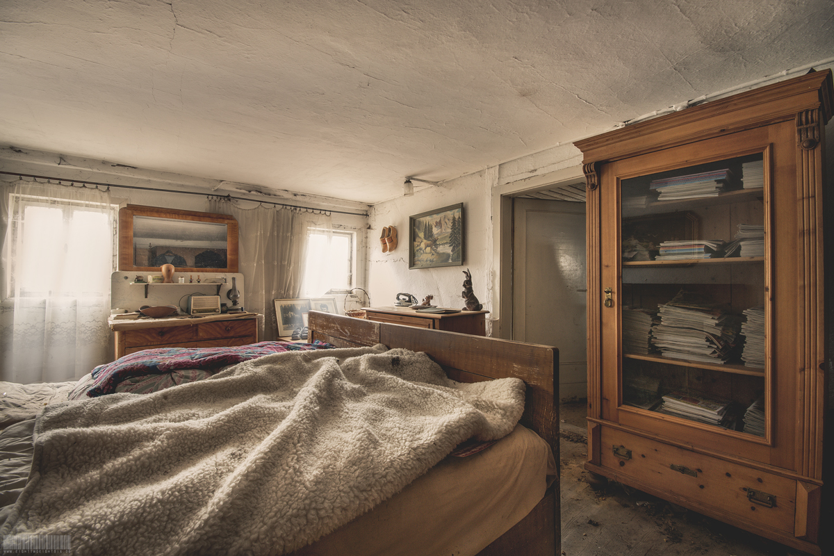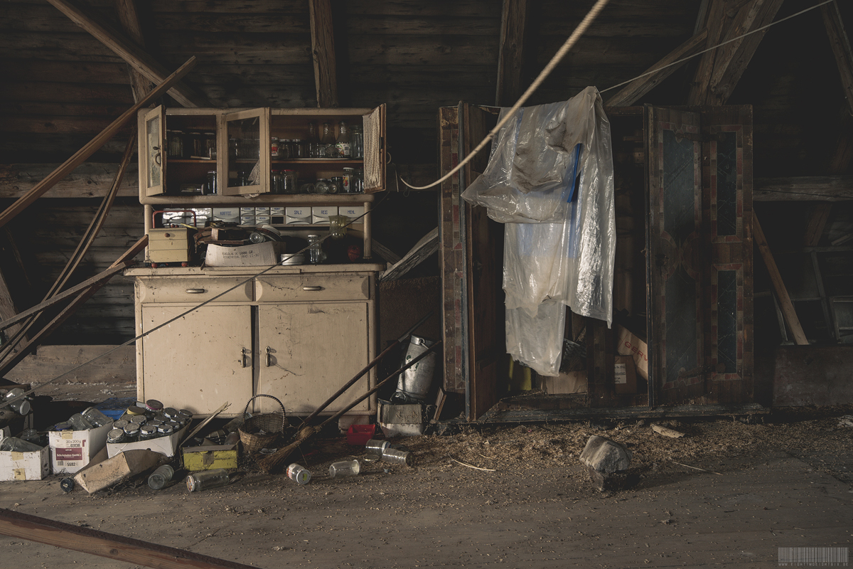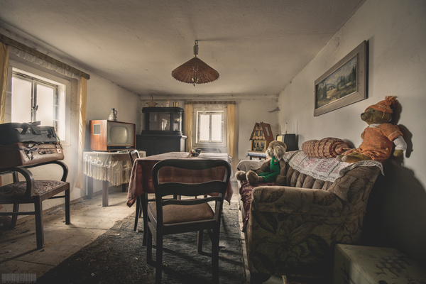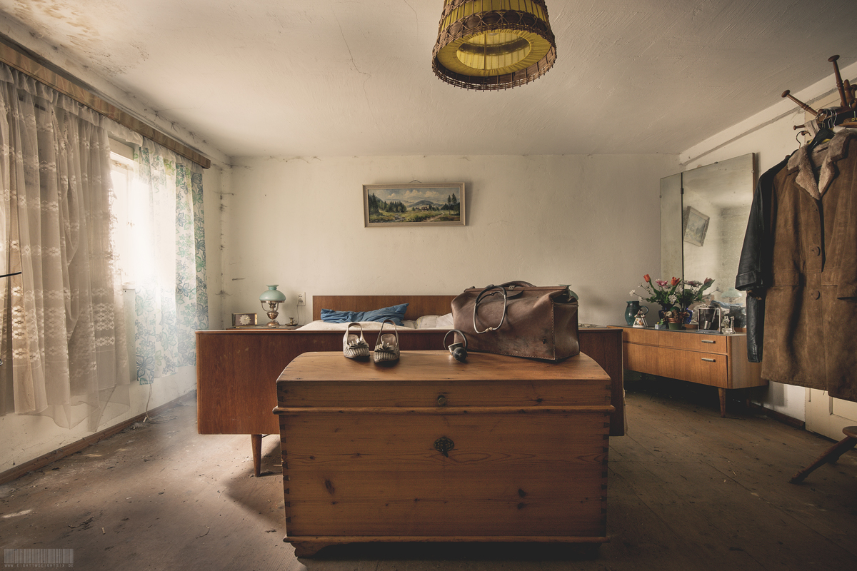 Im Erdgeschoss befand sich ein Wohnzimmer mit Nebenraum, die Küche und ein kleiner Stall. Allerdings waren alle Räume in diesem Geschoss stark durch einen Wasserschaden in Mitleidenschaft gezogen. Dies sorgte allerdings für einen wunderschönen Verfall. Besonders schön anzusehen bei den beiden Sesseln, die sich nach und nach auflösen. Das Obergeschoss war im Bereich des Flurs massiv überflutet von Kisten, gefüllt mit Utensilien jeglicher Art. Des Weiteren befanden sich im Obergeschoss 5 Schlafräume und 3 Wohnräume. Davon waren jedoch nur noch wenige begehbar aufgrund der enormen Ansammlung von Gegenständen davor bzw. auch in den Räumen.