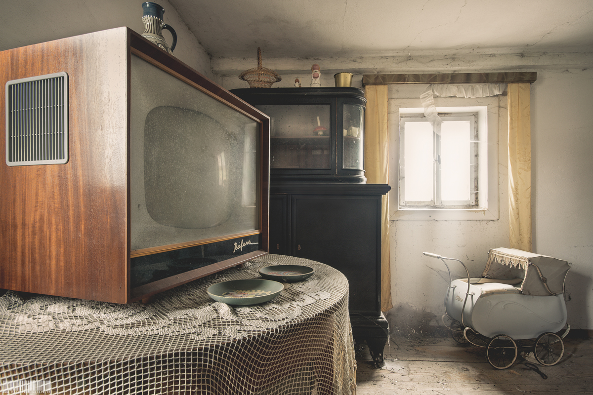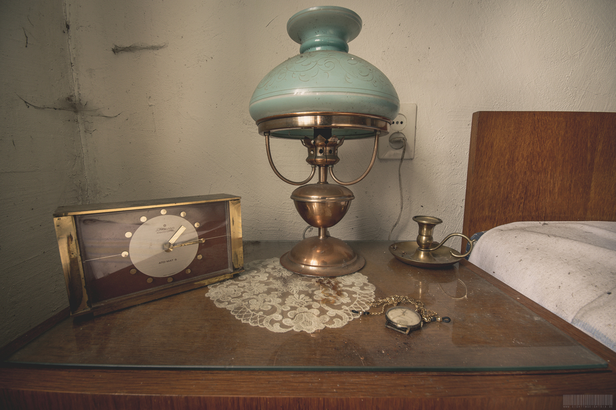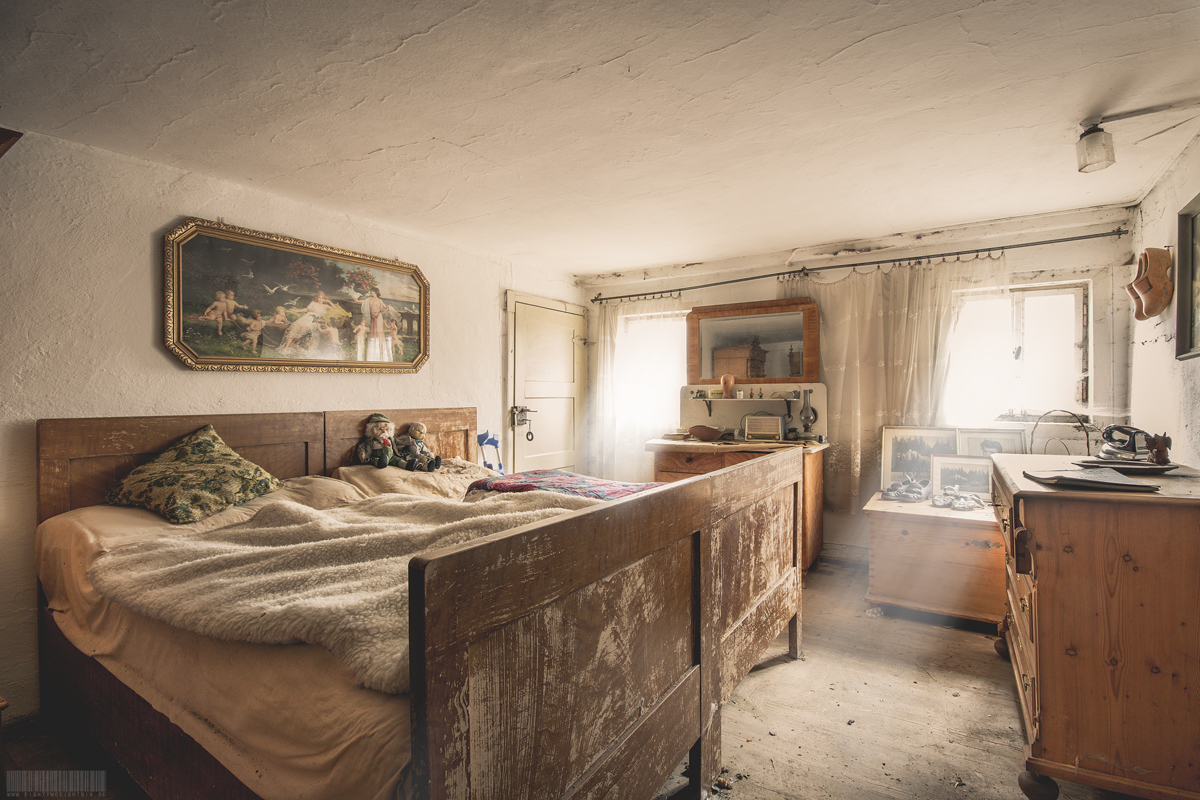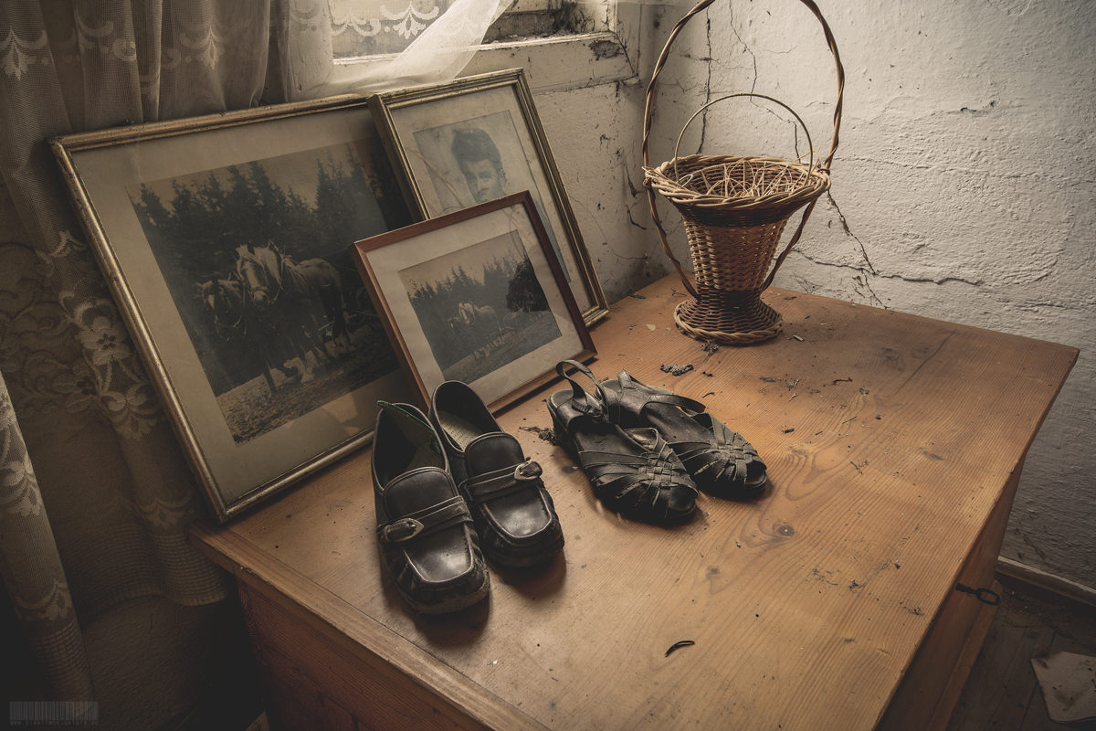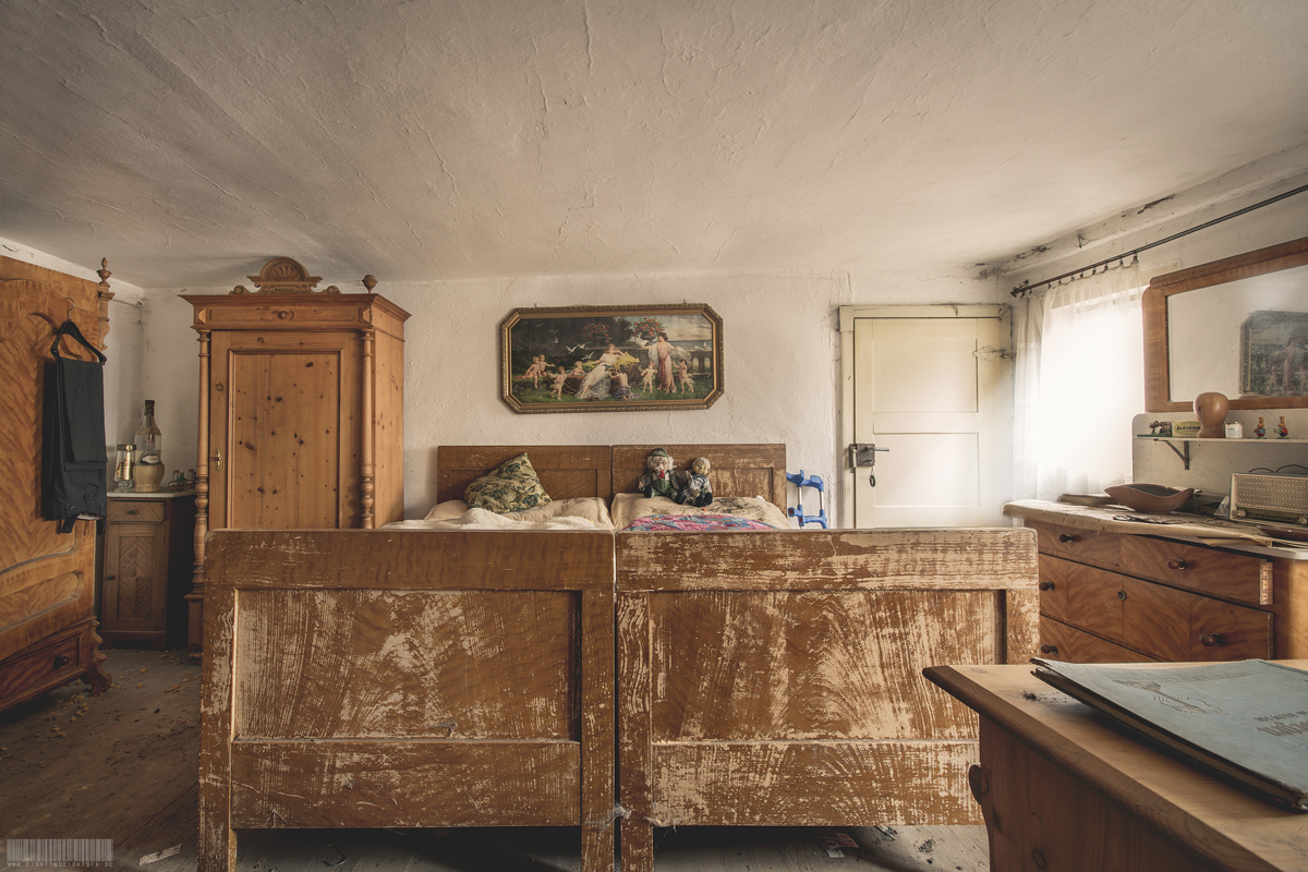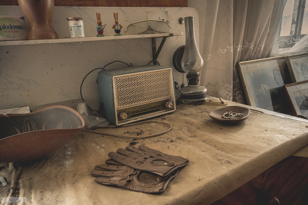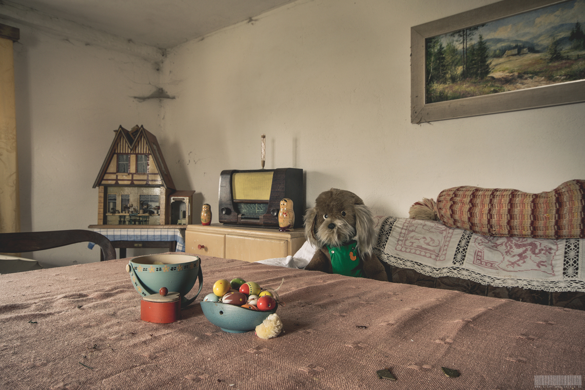 Im Erdgeschoss befand sich ein Wohnzimmer mit Nebenraum, die Küche und ein kleiner Stall. Allerdings waren alle Räume in diesem Geschoss stark durch einen Wasserschaden in Mitleidenschaft gezogen. Dies sorgte allerdings für einen wunderschönen Verfall. Besonders schön anzusehen bei den beiden Sesseln, die sich nach und nach auflösen. Das Obergeschoss war im Bereich des Flurs massiv überflutet von Kisten, gefüllt mit Utensilien jeglicher Art. Des Weiteren befanden sich im Obergeschoss 5 Schlafräume und 3 Wohnräume. Davon waren jedoch nur noch wenige begehbar aufgrund der enormen Ansammlung von Gegenständen davor bzw. auch in den Räumen.