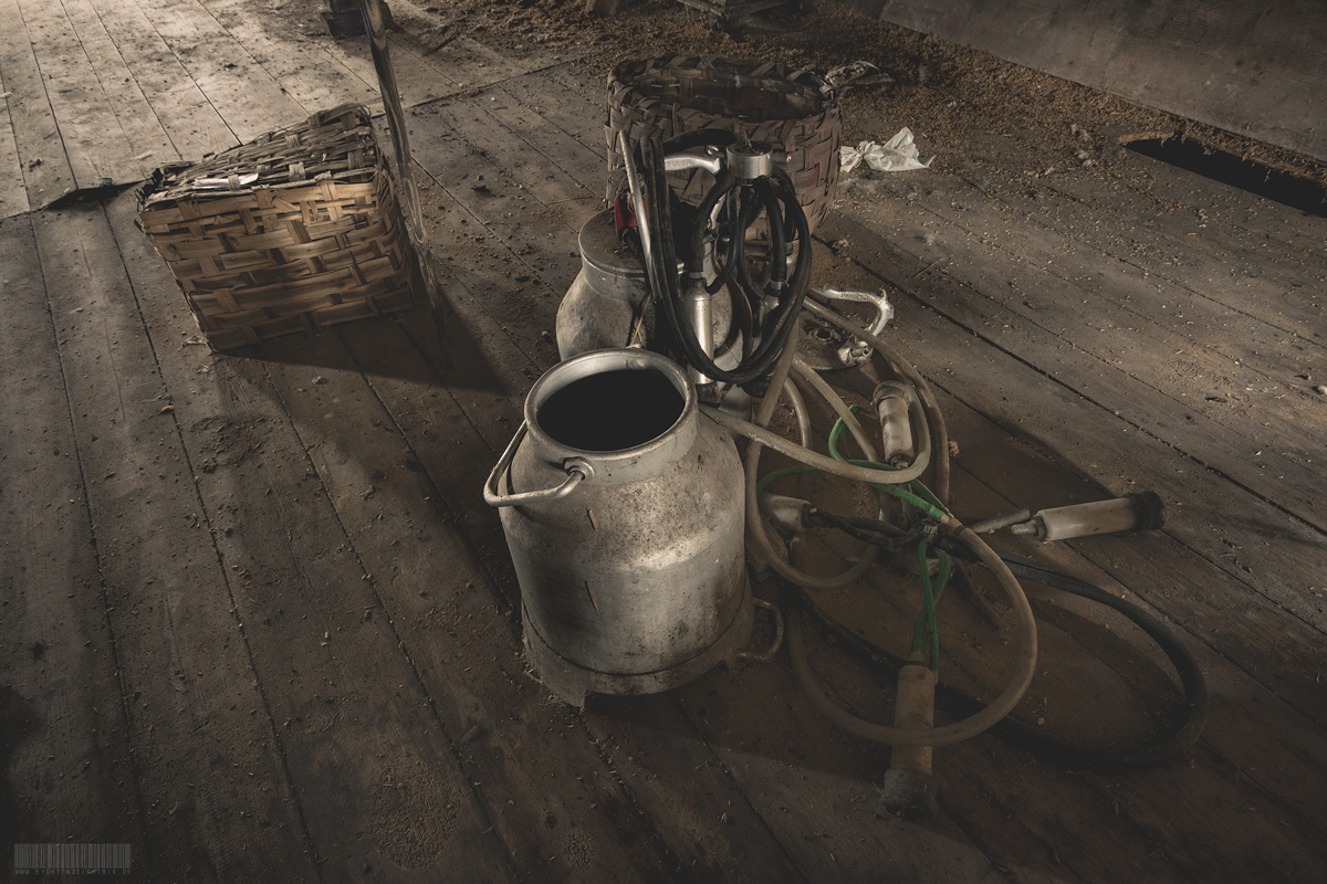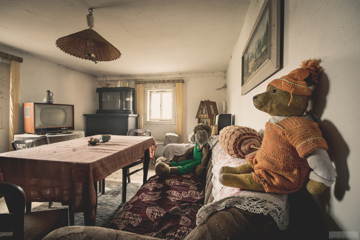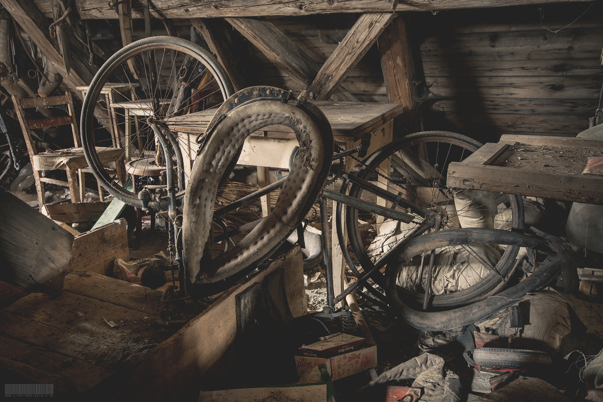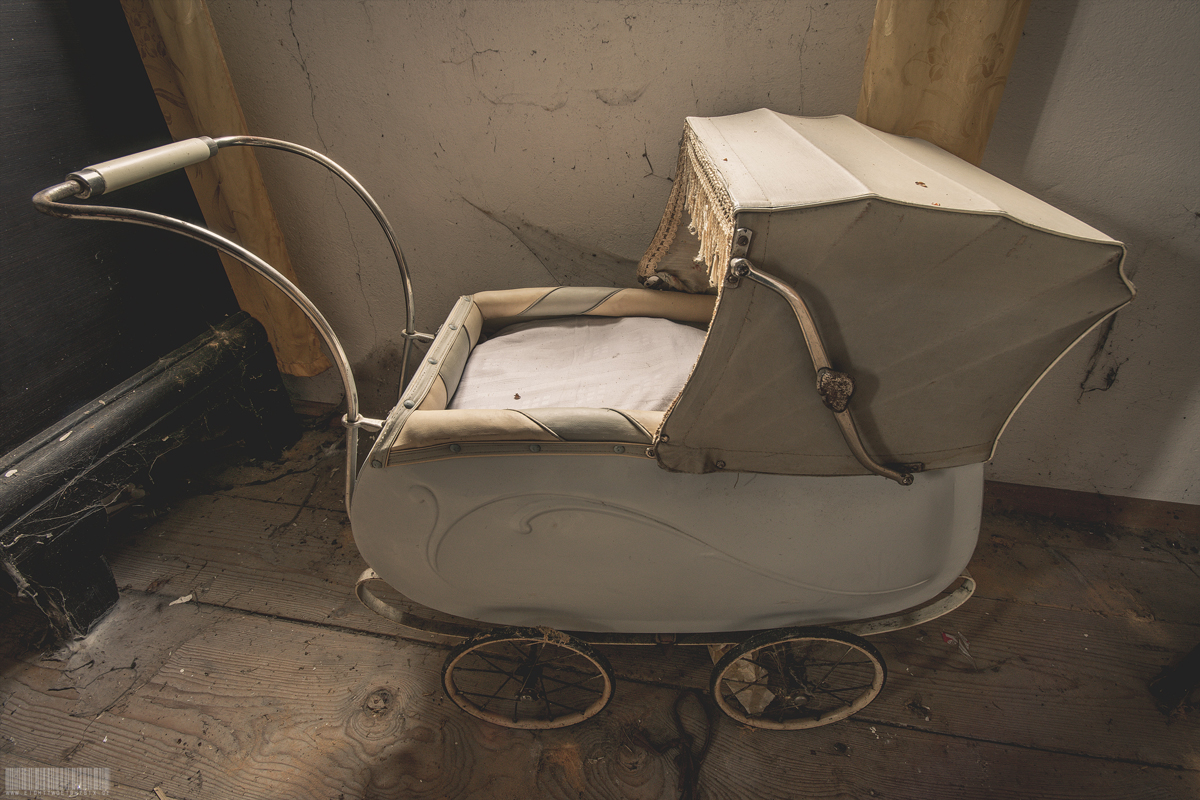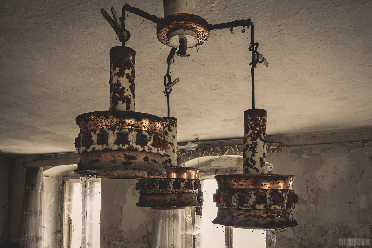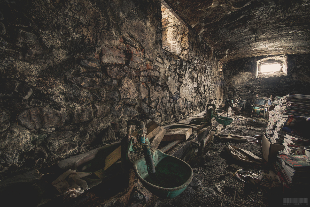 Im Erdgeschoss befand sich ein Wohnzimmer mit Nebenraum, die Küche und ein kleiner Stall. Allerdings waren alle Räume in diesem Geschoss stark durch einen Wasserschaden in Mitleidenschaft gezogen. Dies sorgte allerdings für einen wunderschönen Verfall. Besonders schön anzusehen bei den beiden Sesseln, die sich nach und nach auflösen. Das Obergeschoss war im Bereich des Flurs massiv überflutet von Kisten, gefüllt mit Utensilien jeglicher Art. Des Weiteren befanden sich im Obergeschoss 5 Schlafräume und 3 Wohnräume. Davon waren jedoch nur noch wenige begehbar aufgrund der enormen Ansammlung von Gegenständen davor bzw. auch in den Räumen.