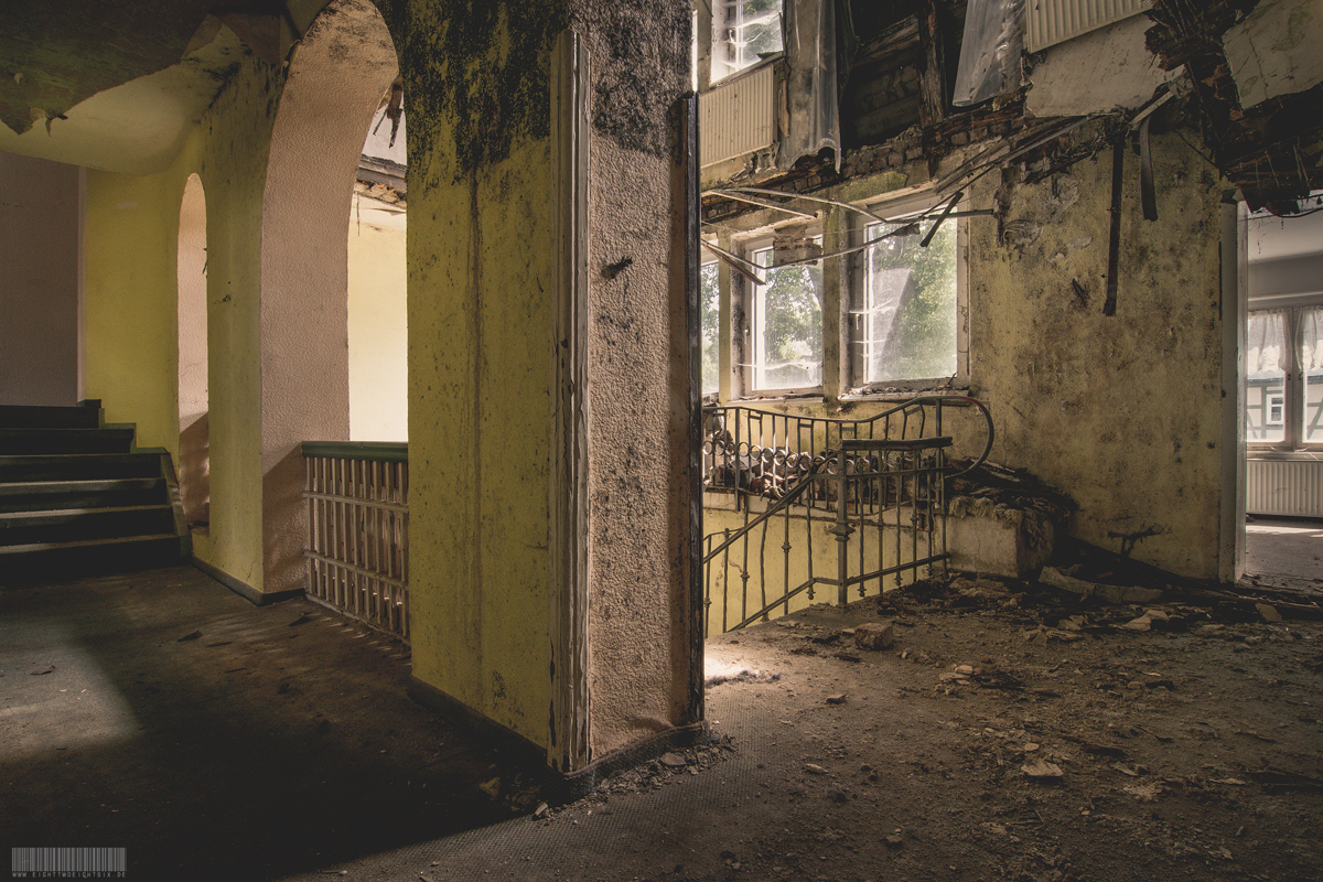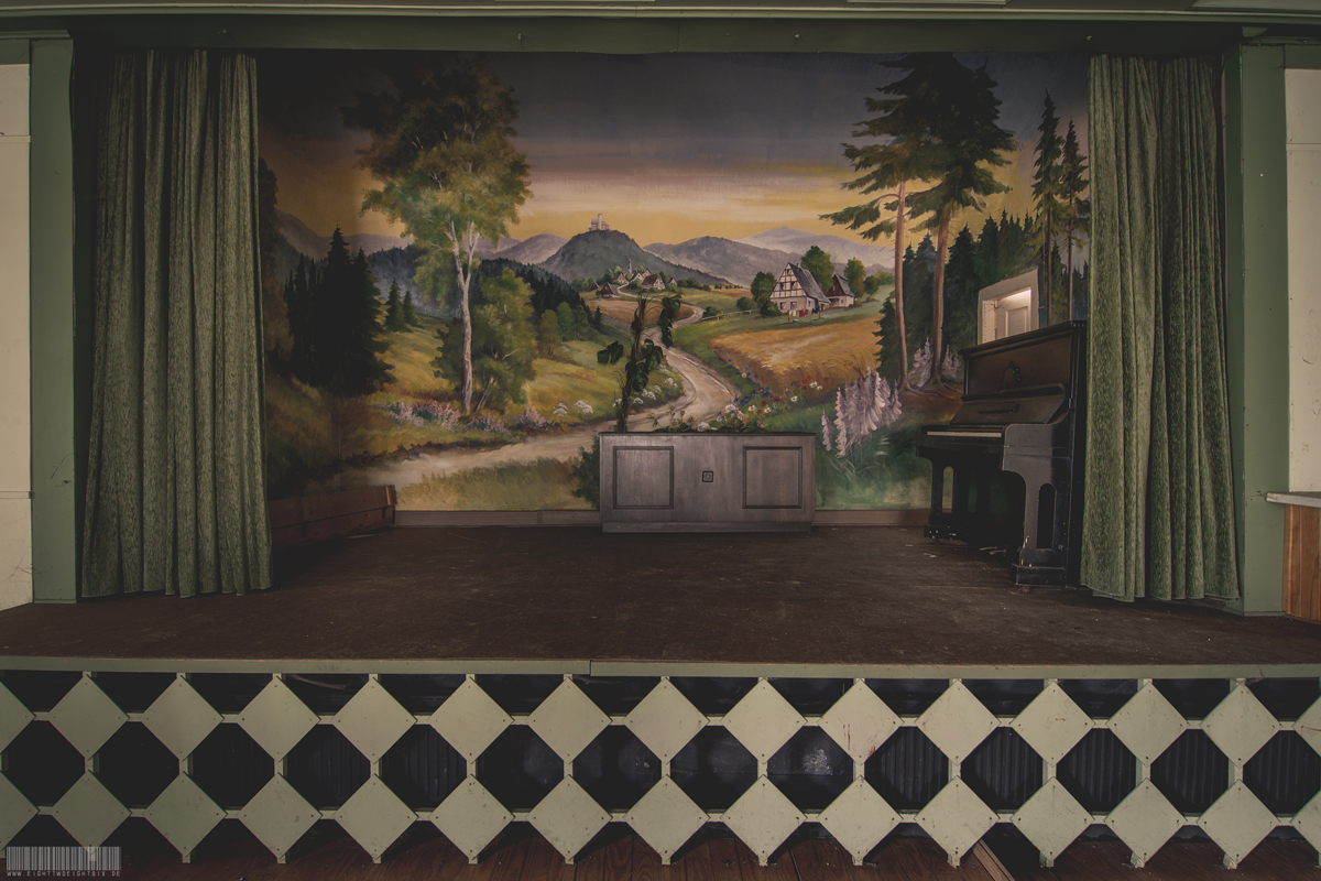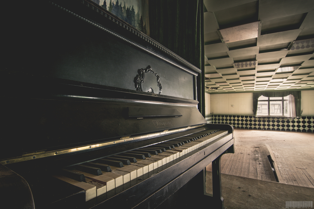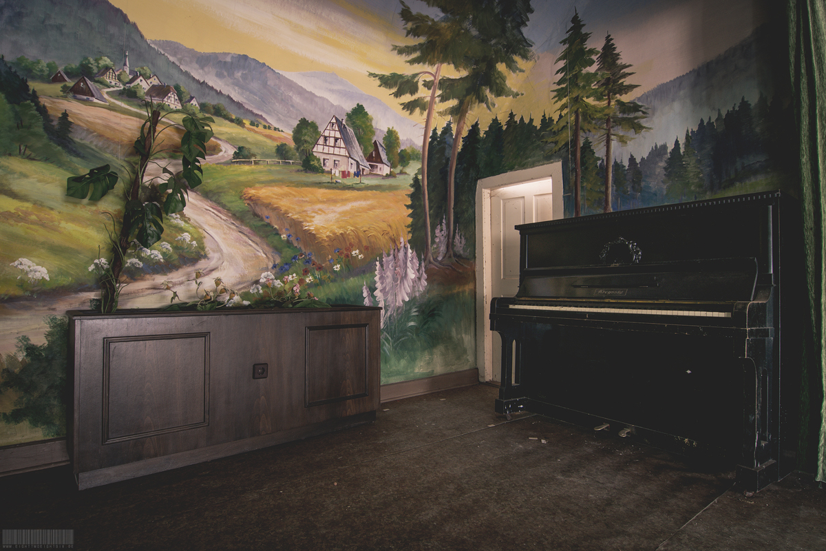 Das verlassene Hotel Harmonie befindet sich im Erzgebirge, in Sachsen. Vermutlich wurde es in den 90er Jahren geschlossen und verfällt seit dem zusehends. Im Gebäude befindet sich allerdings leider nur noch recht wenig bis gar kein Inventar. Allerdings wurde einer der wertvollsten Gegenstände einfach zurückgelassen. Das wunderschöne Klavier der Marke Kreyssig. Es befindet im Gegensatz zum restlichen Objekt noch in erstaunlich gutem Zustand. Denn einige Teile des Gebäudes sind bereits eingestürzt und auch der Saal in dem sich das Klavier befindet wird nicht mehr lang begehbar sein. Das besondere an diesem Lost Place ist zudem die harmonisch wirkende Zeichnung von Bergen, Natur und Fachwerkhäusern vor welcher das Klavier steht. Ein toller Ort.