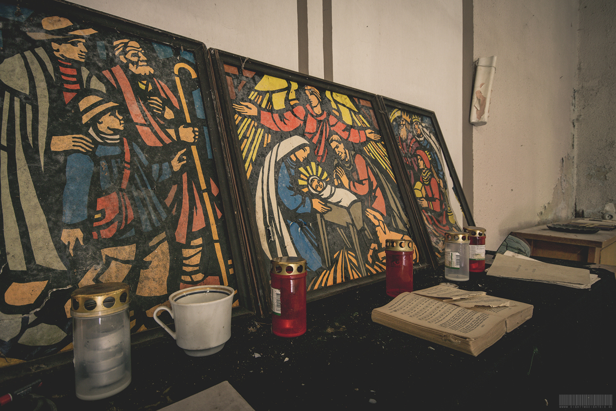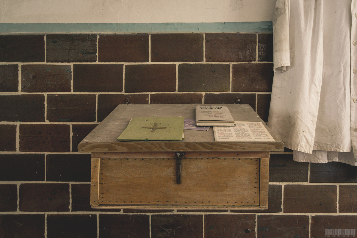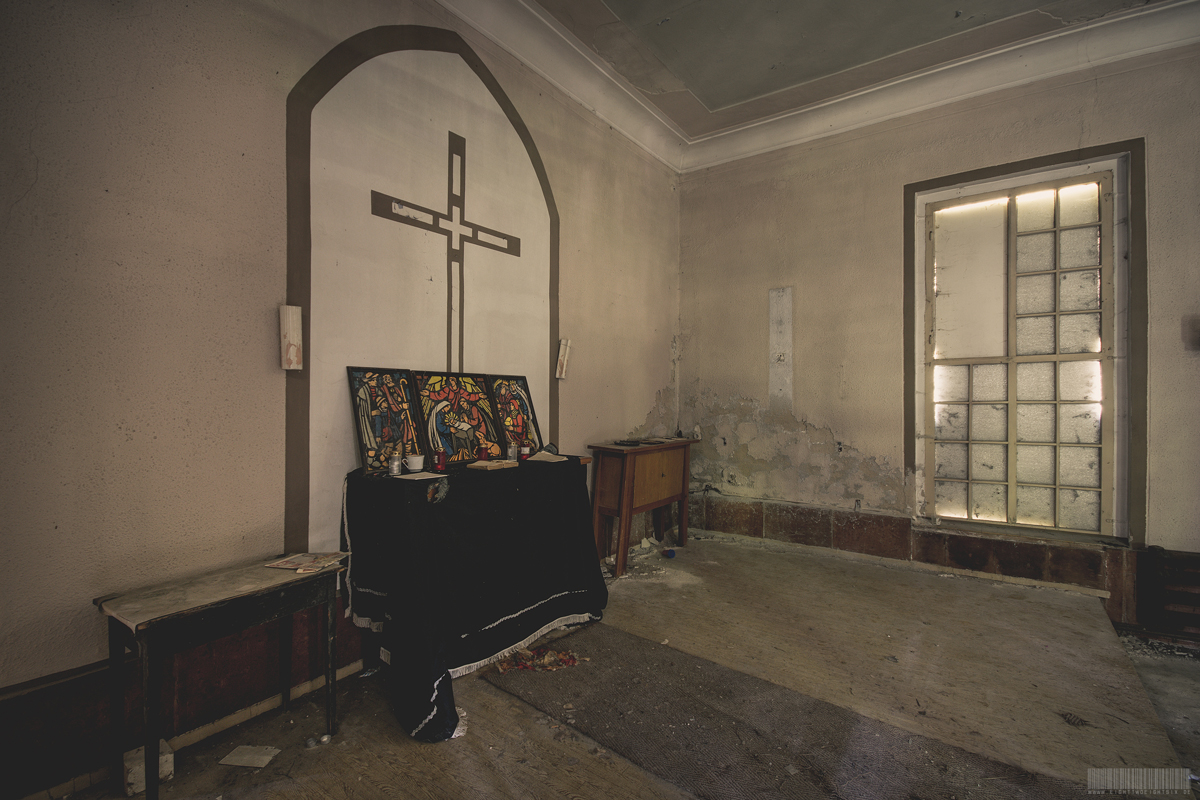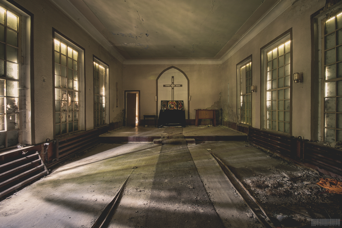 Die verlassene Leichenhalle verfügte außerdem über eine angrenzende Kapelle. Hier wurde den Verstorbenen die letzte Ehre erwiesen. Da dieser Lost Place ursprünglich zu einem Altenheim gehörte, wurden hier vermutlich vorrangig alte Menschen bestattet. Die kleine Kapelle lud nun alle Angehörigen dazu ein, hier in aller Ruhe von Ihren Liebsten Abschied zu nehmen. Geschätzt 50 Personen konnten ohne Weiteres in diesen Räumlichkeiten Platz finden.